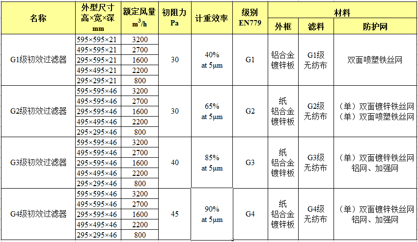 初效过滤器规格参数: