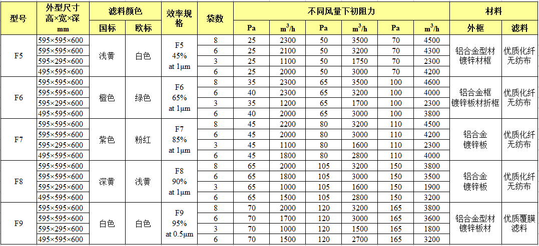F系列中效空气过滤器分袋式和非袋式两种,其中袋式包括F5,F6,F7,F8,F9,非袋式包括FB(板式中效过滤器),FS(隔板式中效过滤器),FV(组合式中效过滤器)。