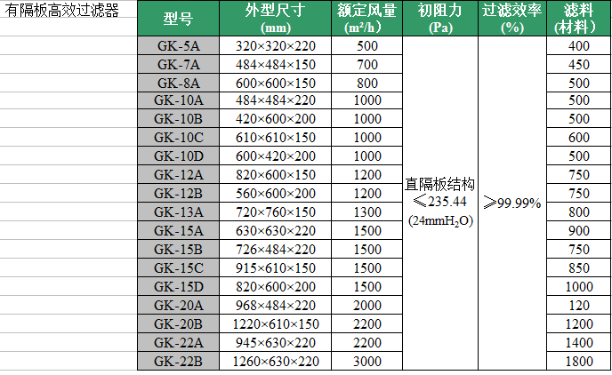 有隔板高效过滤器规格参数: