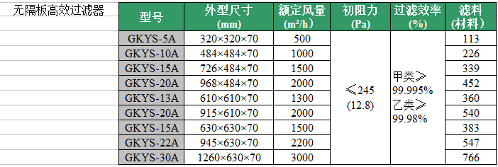 无隔板高效过滤器规格参数: